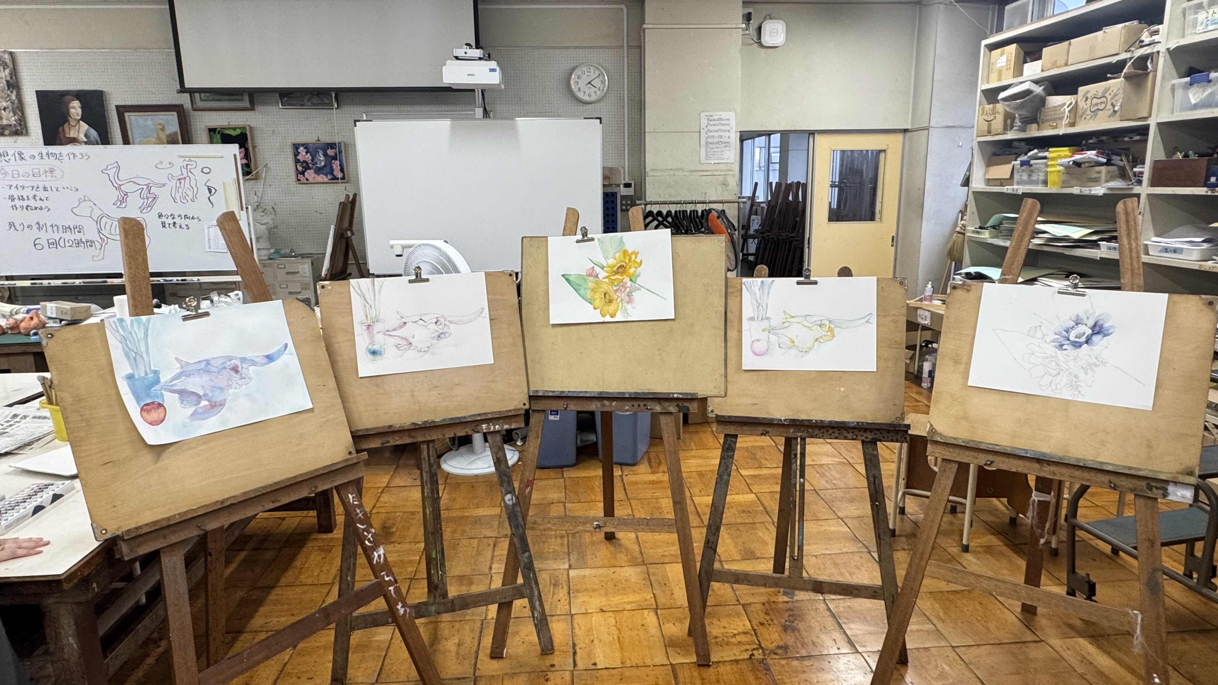 私たち美術部は、令和7年度現在、3年生4名、2年生3名の計7名で、管理棟3階美術室にて活動しています。活動日は、平日の放課後です。