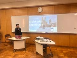 国際人文科1年生が総合英語Iの授業でプレゼンテーションを行いました。 今回のプレゼンテーションは、ブリティッシュヒルズにおける国内英語研修の事後学習として実施しました。生徒たちは研修で学んだ内容や受講した授業を、自分自身の英語でまとめて発表し、心に残った思い出についても紹介しました。 発表では、イギリス文化、テーブルマナー、マナーハウスでの学び、Survival English、スピーチスキル、ドラマ(演劇)など、多岐にわたるレッスンについて述べられました。学んだことを自らの言葉で再構成することは容易ではありませんが、生徒たちは持てる英語力を最大限に生かし、分かりやすく表現することができました。 また、最後の感想では、次年度に控える海外研修を見据え、今後の目標や取り組むべき点を具体的に述べる生徒も多く、学びを未来へつなげようとする姿勢が感じられました。 このプレゼンテーションは、国内研修終了から1週間も経たないうちに、スライドと原稿を作成し、暗記した上で3分間の英語発表を行うという、非常にチャレンジングな取り組みでした。それをやり遂げたこのクラスのエネルギーと、互いを高め合う良い雰囲気に、教員一同大きな成長を感じています。4月から積み重ねてきた真摯な学習の成果を、今回の発表で確かに見ることができました。 次年度はいよいよ海外研修が始まります。英語力のさらなる向上はもちろん、どんなことにも真剣に向き合う姿勢と、クラスとしてのチームワークを一層深め、より大きな成長へつなげてほしいと願っています。