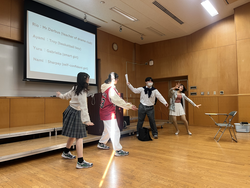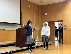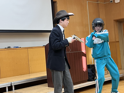 国際人文科3年生が、ディベートディスカッションの授業で、最後の発表を行いました。 今年度の最終発表は、スキット(英語劇)です。今回の条件は1つ。 「英語の歌を必ず入れて披露すること」でした。単なる英語劇ではなく、ミュージカル風に英語の歌を織り交ぜながらの発表でした。 これは、国際人文化では初めての取り組みです。英語、歌、ダンス、などたくさんの要素を取り入れて各グループの発表は非常に完成度の高いものばかりでした。特に、印象に残っているのは、「Sister Act ~天使にラブソングを~」と「Toy Story」チームです。 この二つのチームの良い点は、話の内容を端的にわかりやすく表現している、歌のクオリティ、そしてパフォーマンスがオーディエンスを楽しませる工夫が多かったところにあります。実際に、クラス投票、教員票も多く集め、ベストグループの2つに選ばれました。 英語劇の難しい点は、一つのお話を成り立たせること、英語でわかりやすく観客に伝えられることです。 はじめて英語劇を授業で取り入れる時は、どの学年の生徒も心配そうに計画を立て、練習をしている姿がありましたが、このクラスは、回を重ねていくたびに、衣装や小道具、背景や音楽などさまざまなアイディアで完成度を高めていきました。 最後にALTや担当教員から、チームワークが良い、アイディアが良い、人を楽しませる工夫があったなどさまざまなコメントをもらいました。卒業後の進路で、人前で何か話すとき、または誰かとチームで働くとき、ぜひチームを引っ張っていける人になって欲しいと願っています。