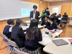 国際人文科2年生のディベートディスカッションの授業で、即興型ディベートを開始しました。 即興型ディベートとは、トピックを与えられてから15分で準備をして3対3でディベートを行うスタイルのディベートを指します。 初日の今日は、ディベートを学ぶ意義や英語でディベートを練習していくことで得られるスキルなどを知り、ルールの説明、ディベートのやり方を学びました。そして実際に15分間の準備時間をとってディベートを開始しました。 少人数で行うこの授業では、12~13人1グループに対して日本人教員とALTがペアで指導にあたり、ディベートのような高度な取り組みにも丁寧に指導を行います。 今回は初回なので、ルールを確認しながらディベートに挑戦していきました。 準備段階では、トピックに対して、自分の意見を考えること、各チームの意見をまとめることの難しさ、相手の主張を予想し反論を想定する難しさ、またそれを英語に素早く変換し、いかに論理的に相手に伝えられるか、という多くの壁が立ちはだかります。論理的かつ明確に自分の立場の意見をまとめる力が必要です。今回の授業では、考え方や立論の仕方には焦点を当てずに行いましたが、次回以降はその点に焦点を当て、考える力を伸ばしていきます。 初めてのディベートはとても難しい!!と言いながらも、とても楽しそうに英語で意見を述べている姿は、海外研修を終えた生徒たちの大きな成長だと感じました。