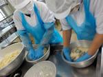 ポテトたこ揚げは、見た目はたこ焼きそっくりなので、子どもたちはとても喜んでいました。たこ焼き機は給食室にないので、ポテトをつぶしてたこ焼きのタネと合わせて形をつくり、揚げてつくりました。何個でも食べられると言っていた児童もいました。うどんとの組み合わせで、お腹いっぱいになったようです。 |