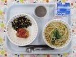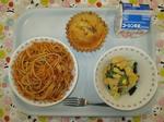 トマトとツナのスパゲティー コーンフレークサラダ マロンケーキ ぎゅうにゅう |