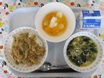 わかめごはん がんもとやさいのふくめに たまねぎとじゃがいものみそしる オレンジ ぎゅうにゅう |
