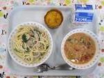 きのこのクリームスパゲティ トマトとたまごのスープ かぼちゃマフィン ぎゅうにゅう |