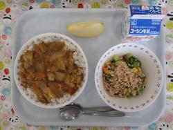 チキンカレーライス たまねぎドレッシングサラダ りんご ぎゅうにゅう |