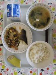 ごはん さばのソースやき みそしる ひじきとれんこんのいりに りんご ぎゅうにゅう |