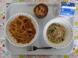 スパゲティミートソース ツナサラダ チョコチップマフィン ぎゅうにゅう |
