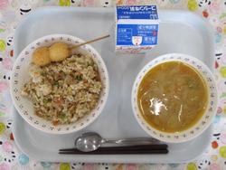 ごもくチャーハン うずらたまごフライ とうにゅうたんたんスープ ぎゅうにゅう |