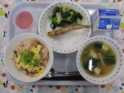 さくらちらしずし ししゃものからあげ なのはなのからしあえ しらたまいりすましじる いちごゼリー ぎゅうにゅう |