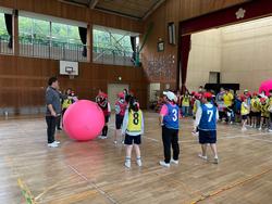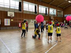 親子で協力して、大きなボールを落とさずにつないでいました。