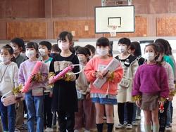 | 今年、一番関わりの深かった1年生の発表です。かわいらしく、また、感謝の気持ちの詰まった発表に、6年生の表情も素敵なものに見えます。「自分たちも6年生みたいに立派になりたいです」というメッセージにぐっときたのではないでしょうか。 | |