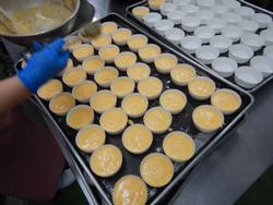 溶かしたバターと砂糖を混ぜ合わせたら、卵を入れてさらにかき混ぜます。学校の近くには大きな卵が落ちていなかったので、普通の卵を約200個使いました。その後、米粉、ベーキングパウダー、牛乳をいれてさらに混ぜて、生地ができあがります。
