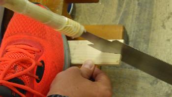 のこぎりを引いているのは3年生ですが、木材を固定している(足と指)のは教員です。