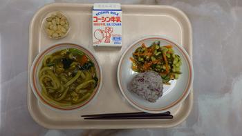 今日の給食は、カレーうどん、ゆかりおにぎり、茎わかめと青大豆のサラダ、黒糖きな粉豆、牛乳です。