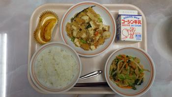 今日の給食は、ご飯、ジャーチャン豆腐、かんぴょうのごま和え、焼きリンゴ、牛乳です。
