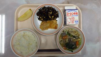 今日の給食は、ご飯、鶏肉のスタミナ焼き、大豆とひじきの煮物、ごま味噌けんちん汁、リンゴ、牛乳です。