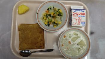 今日の給食は、セサミトースト、クラムチャウダー、キャベツとブロッコリーのサラダ、パインアップル、牛乳です。