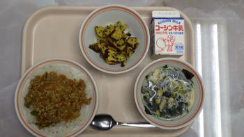 今日の給食は、豚味噌丼、コーンわかめスープ、大学芋、牛乳です。