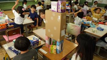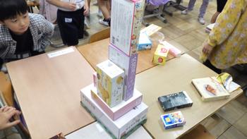 平面や曲面などの面の構成についてを、箱でタワーや電車を作る活動を通して理解していきます。