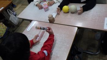 1年生の「かたちあそび」の授業です。この授業では、立体図形についてその特徴を遊びを通して理解していきます。