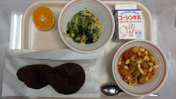 今日の給食は、ココア揚げパン、豆とウィンナーのトマト煮、海藻サラダ、菊花ミカン、牛乳です。