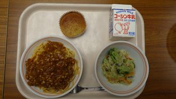 今日の給食は、スパゲッティミートソース、キャベツとブロッコリーのサラダ、ブルーベリーのマドレーヌ、牛乳です。