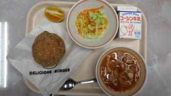 今日の給食は、手作りカレーパン、ビーンズトマトスープ、フレンチドレッシングサラダ、はやか、牛乳です。