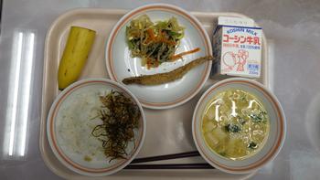 今日の給食は、ご飯、カルチャン佃煮、ししゃもの代わり揚げ、海苔ごまナムル、かき玉汁、バナナ、牛乳です。