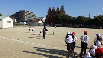 体育で、校庭を1年生と6年生が使って持久走の学習を行っていました。