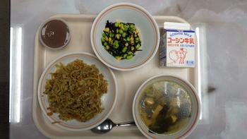 今日の給食は、そばめし、枝豆とひじきのマリネ、鳥とわかめのスープ、手作り豆乳ココアプリン、牛乳です。
