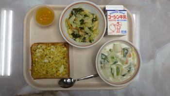 今日の給食は、エッグトースト、白菜とかぶのクリーム煮、カリカリわかめサラダ、たっぷりみかん手作りゼリー、牛乳です。