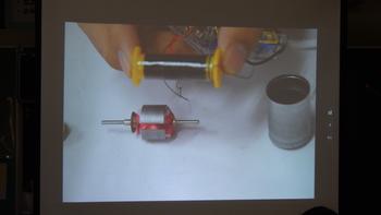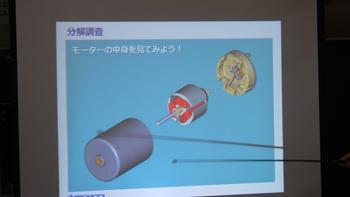 スクリーンに、プレゼンテーションソフトを使った説明や、実物のモーターを映し出し、電磁石の機能を丁寧に教えていただきました。