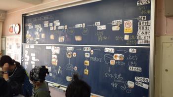 黒板には、今日の手順が掲示してあります。子ども達は、時折黒板を確認しながら、調理を進めていました。