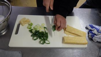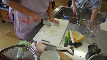 味噌汁の具を用意します。慣れない包丁に戸惑っている子もいましたが、友だち同士助け合って作業を進めました。