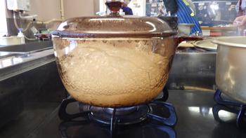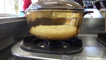 お米はガラスの容器で炊きます。お米が炊き上がっていく様子を見ることができました。