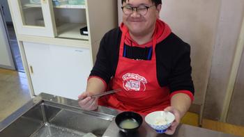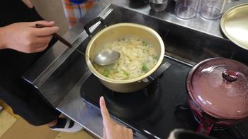 ガスコンロでご飯を炊き、味噌汁を作る学習です。