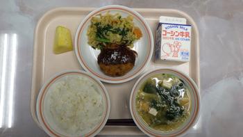 今日の給食は、ご飯、キャベツ入りメンチカツ、ごま和え、味噌汁、パインアップル、牛乳です。