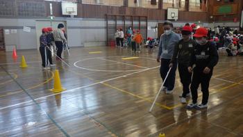 目隠しして、目が不自由な人の体験です。何も見えないと、ちょっと歩くだけでも怖いですね。