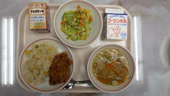 今日の給食は、ガーリックライス、クリスピーチキン、レモン風味サラダ、野菜のコンソメスープ、クリスマスチョコケーキ、牛乳です。