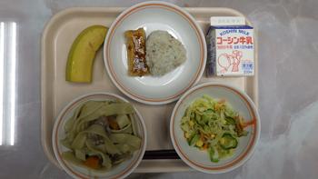 今日の給食は、ほうとううどん、はなむすび、生揚げのかりん揚げ、コーンサラダ、バナナ、牛乳です。