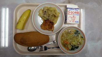 今日の給食は、コッペパン、タンドリーチキン、ジャガイモときのこのソテー、キャベツとベーコンのスープ、バナナ、牛乳です。