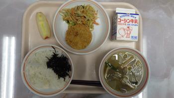 今日の給食は、ご飯、手作りひじきのふりかけ、あじさいネギのコロッケ、練りごま和え、千葉の恵み汁、リンゴ、牛乳です。