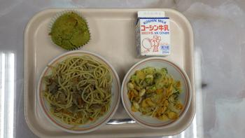 今日の給食は、ボンゴレスパゲティ、お豆のカリカリサラダ、さつまいも抹茶ケーキ、牛乳です。