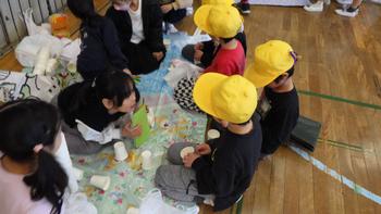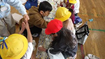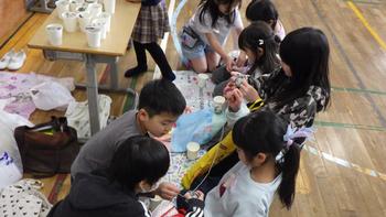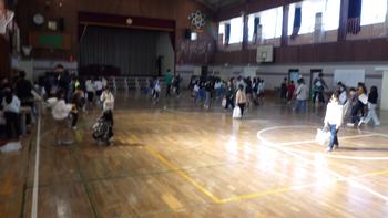 2年生は、体育館に残って後片付け。おもちゃづくりででたゴミもしっかり拾っていました。