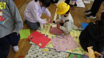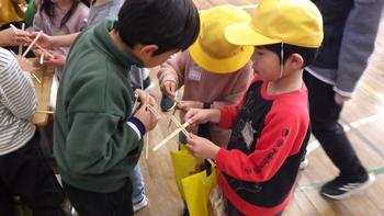 2年生が1年生のために、手作りおもちゃの作り方を調べて覚え、それを教えるという学習活動です。