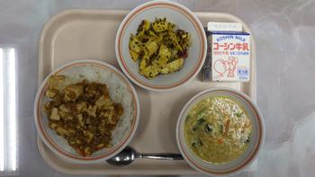 今日の給食は、麻婆豆腐丼、中華卵スープ、大学芋、牛乳です。