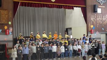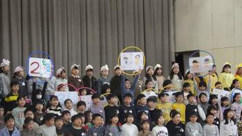4年生に学習したことを思い出す内容でした。国語の「ぞろぞろ」で学習した落語や社会で覚えた47都道府県を、おもしろい演出で披露した後、音楽の「ちゃいろのこびん」を合奏しました。