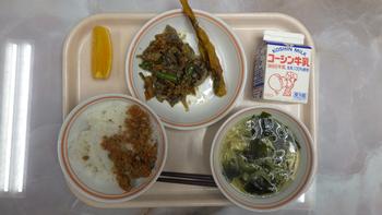 今日の給食は、ご飯、ツナ大豆そぼろ、ししゃものカレー揚げ、五目きんぴら、わかめとえのきのスープ、ネーブルオレンジ、牛乳です。