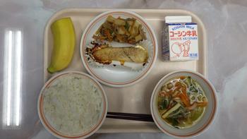 今日の給食は、ご飯、サワラの西京焼き、かむかむきんぴら、ちんげん菜のスープ、バナナ、牛乳です。