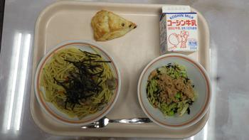 今日の給食は、和風きのこスパゲティ、ひじきと枝豆のサラダ、手作りチョコチップスコーン、牛乳です。